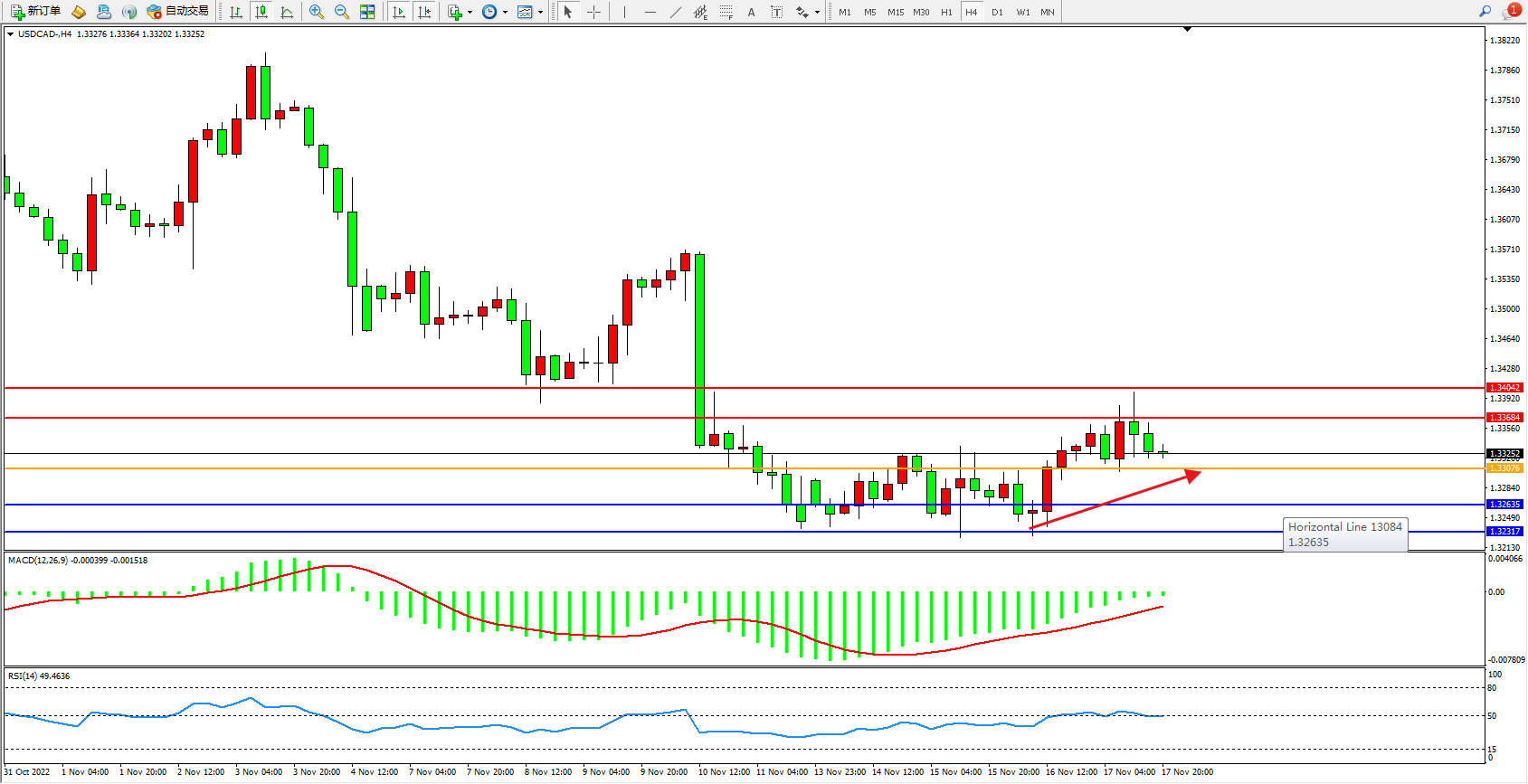 美元加元USDCAD——4小时K线图显示: