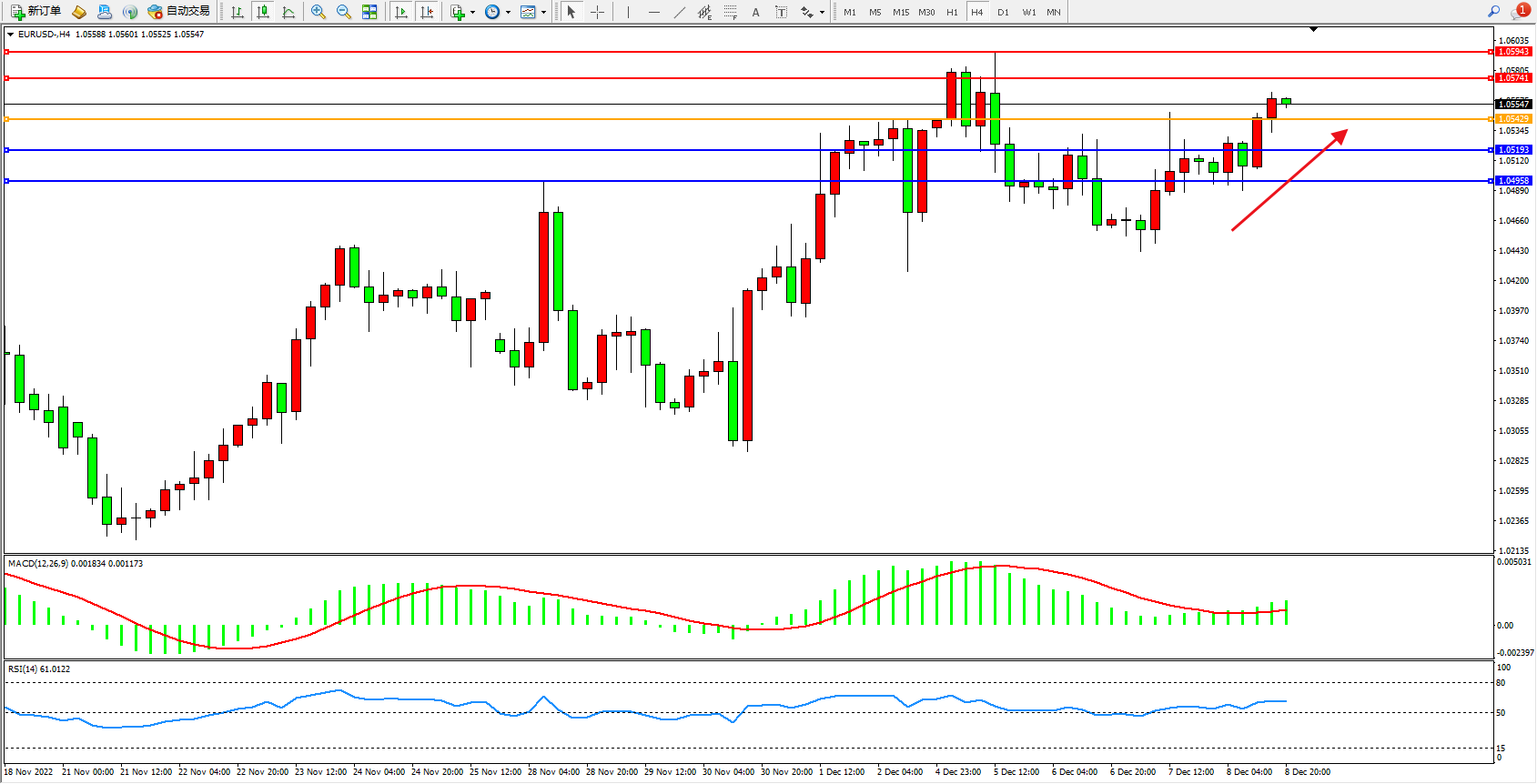 欧元美元EURUSD—4小时K线图显示: