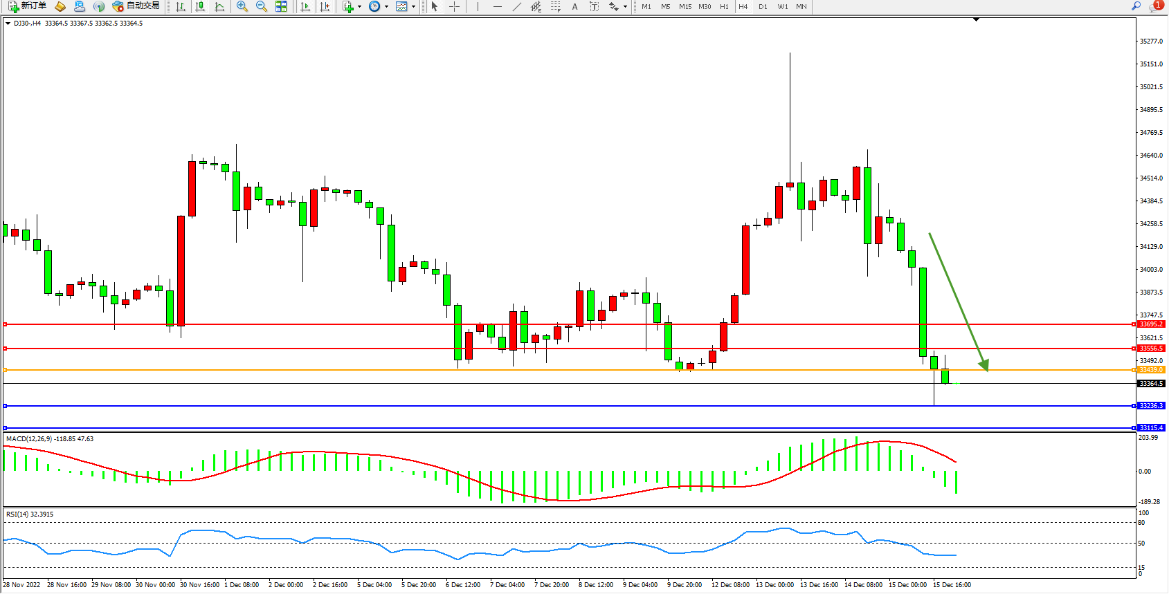 道琼斯指数12月15日(周四)收盘下跌763.54点,跌幅2.25%,报33202.81点;美联储在隔夜释放出未来继续加息的信号,但本次美联储50基点的加息,明显少于上次决议,而且未来的加息幅度可能还会继续放缓,由于美联储同时下调了经济增速预期,未来美国经济仍然步履维艰。