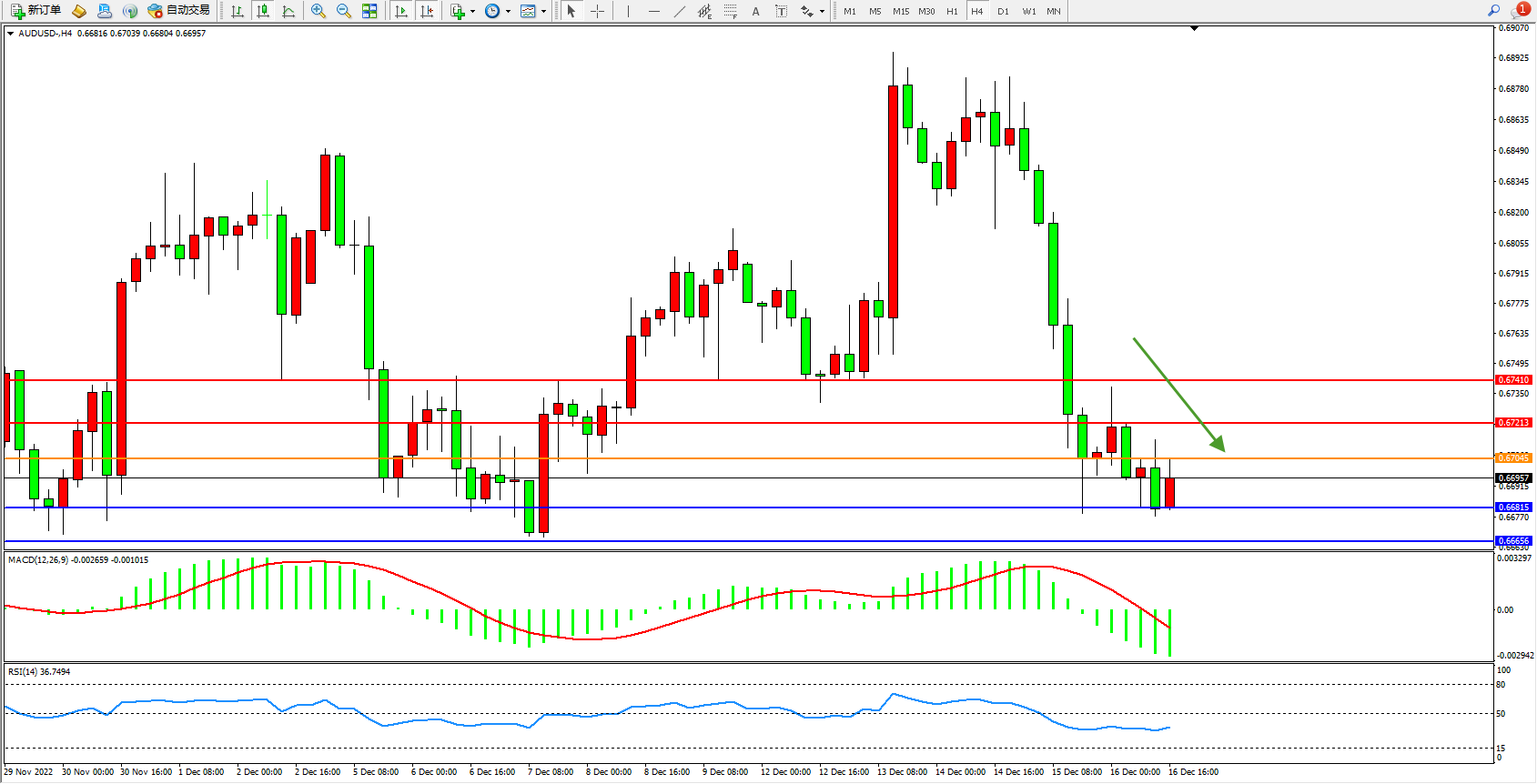 交易策略:0.67045下方看跌,目标0.66815、0.66656