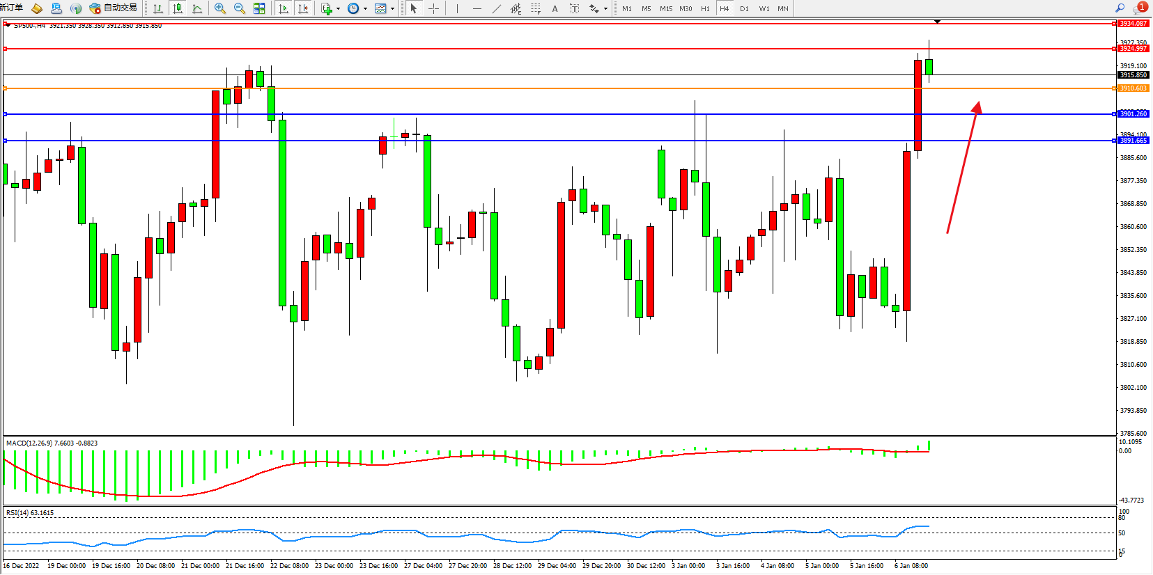 标普500指数1月6日(周五)收盘上涨85.50点,涨幅2.25%,报3893.60点;美国失业率从3.6%下滑至3.5%,为自1960年代末以来的最低水平。时薪月率小幅上涨0.3%,表明薪资水平正在降温;薪资增速年率从4.8%放缓至4.6%,为2021年夏天以来的最小涨幅。