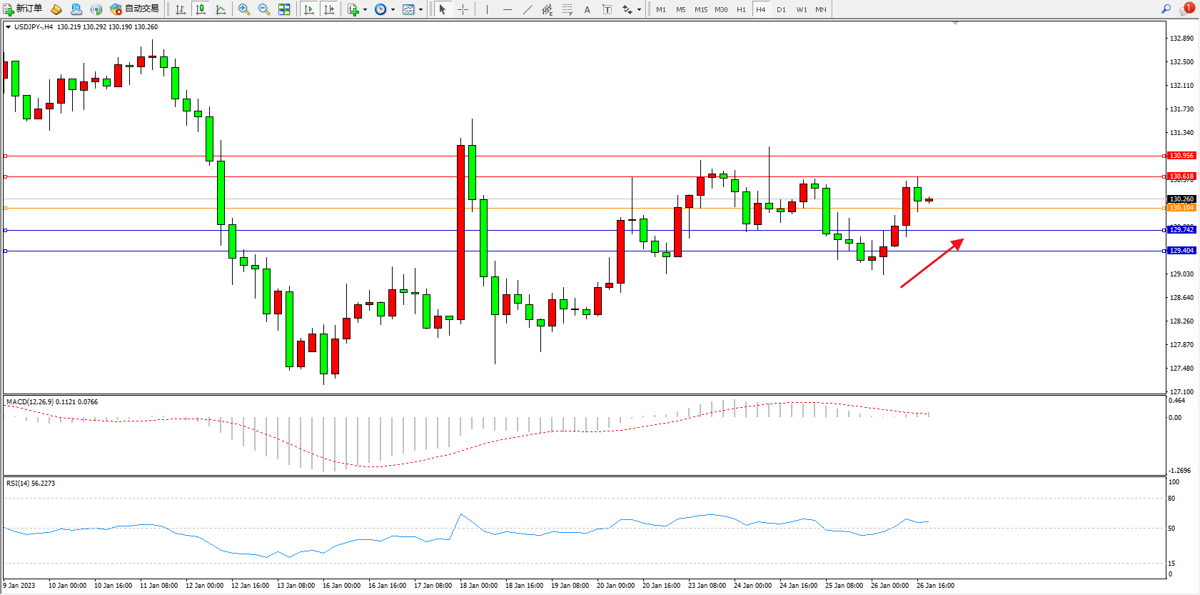 4小时图看:短期多头动力维持震荡缓慢上行,市场看涨情绪开始缓慢涌现,多头动力震荡上行,MACD指标处于轴线附近弱势整理,RSI指标处于50均衡线上侧弱势徘徊;