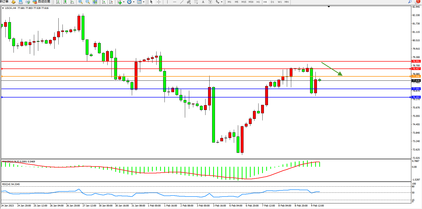 交易策略:77.615下方看跌,目标77.001、76.402