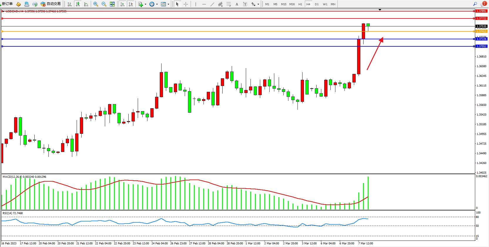 美元加元USDCAD——4小时K线图显示: