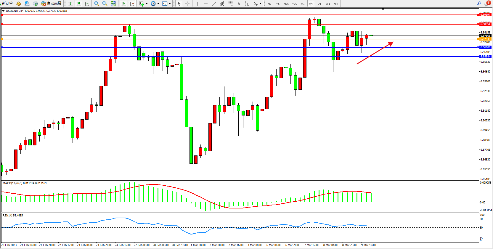 交易策略:6.97538上方看涨,目标6.98854  6.99697