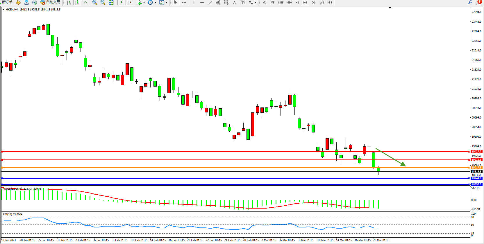 香港恒生指数3月20日(周一)收盘下跌517.88点,跌幅2.65%,报19000.71点;瑞信被迫“贱卖”,市场担忧情绪蔓延。港股全天维持跌势,行业板块近乎全部下跌,市场信心十分低迷。恒生科技指数午后一度大跌4%,最终下跌2.75%,恒指、国指分别跌2.65%和2.21%,恒指险守19000点。科技股、大金融股集体下跌拖累市场重挫,香港本地银行股领跌,汇丰、渣打跌幅最大,小米、阿里巴巴、京东等权重科技股皆走低;南下资金逆势净流入71.01亿港元,大市成交额为1294亿港元。