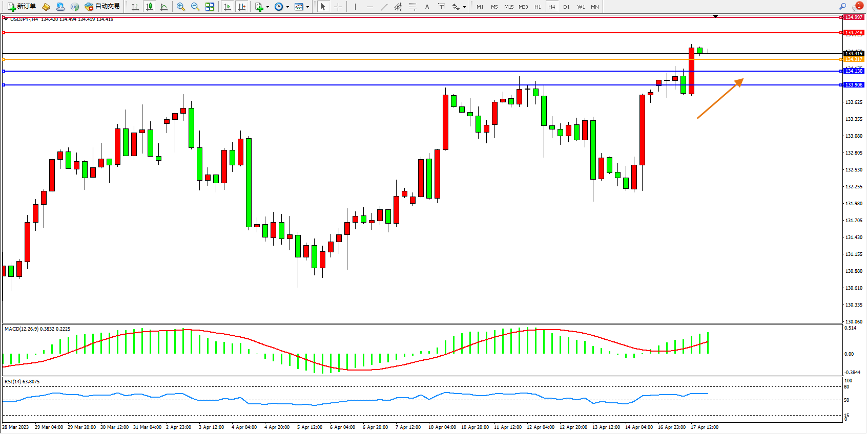 交易策略:134.317上方看涨,目标134.748 134.997