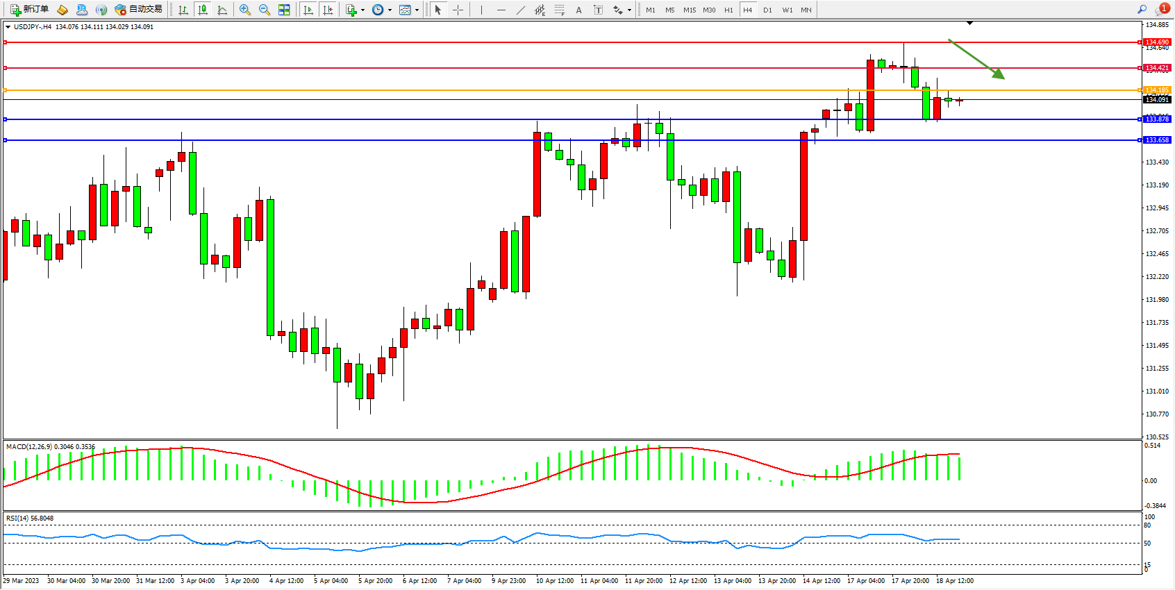 4小时图看:高位空头动力震荡下行,市场空头动力情绪笼罩,短期有继续维持高位整理向下移动迹象,MACD指标处于多头区域高位整理,RSI指标处于50均衡线上側徘徊;