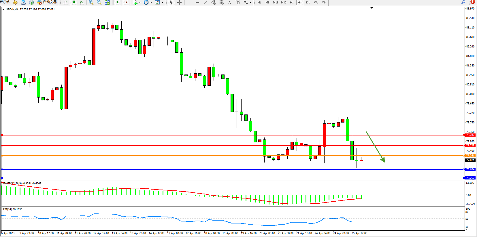 交易策略:77.261下方看跌,目标76.534 76.252