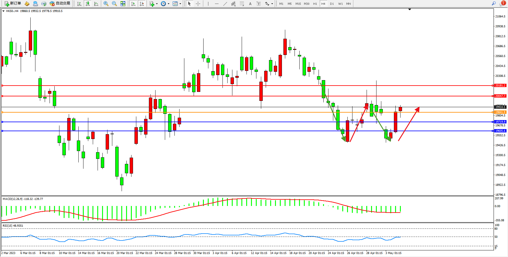 香港恒生指数5月4日(周四)收盘上涨249.57点,涨幅1.27%,报19948.73点;港股大金融等权重股走高,带动恒指涨1.27%上扬近250点,国指涨1.96%,恒生科技指数相对平淡,午后曾一度转跌,最终收涨0.55%。大金融股(内险、中资券商、内银)全天表现强势,民生银行大涨逾10%表现尤其亮眼,南下资金全日净流入44.27亿港元,大市成交额为1052亿港元。