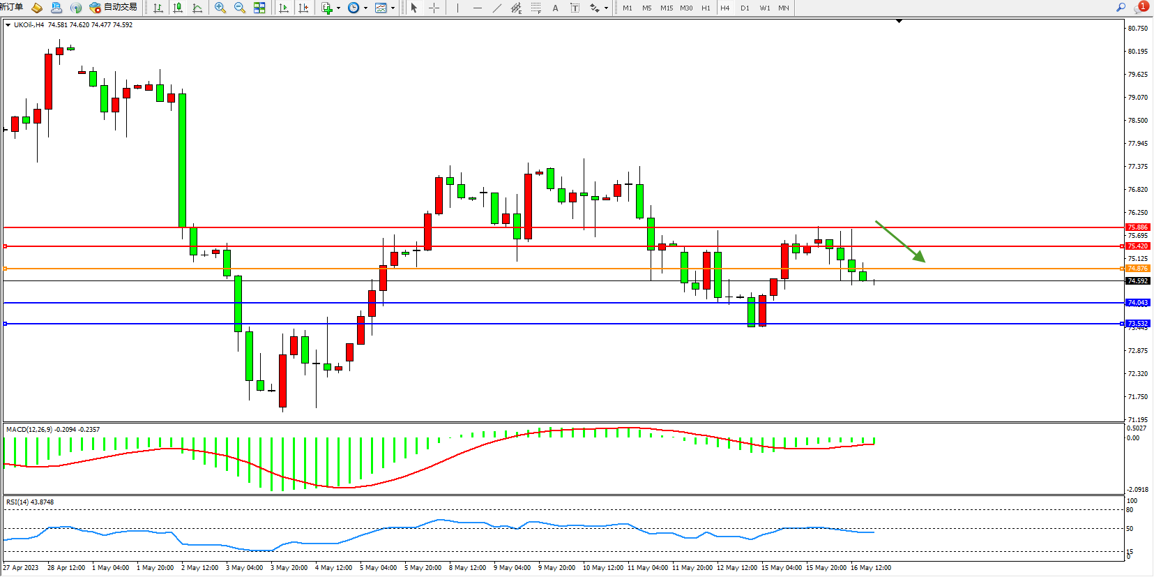 布油维持74.592附近震荡,IEA月报:将2023年全球石油需求增长预期上调20万桶/日,受中国经济反弹影响,石油需求增幅将超过预期。尽管俄罗斯宣布减产50万桶/日,但它可能会增加产量来弥补损失的收入。全球石油供应在4月份下降了23万桶/日,降至1.011亿桶/日。