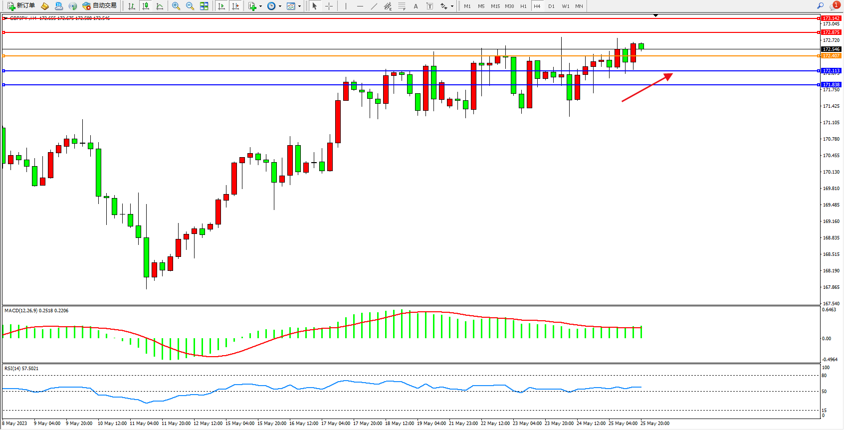 英镑兑日圆维持172.541附近震荡,目前预计英国央行6月加息25个基点至4.75%的可能性为98.54%,有很小可能加息50个基点。