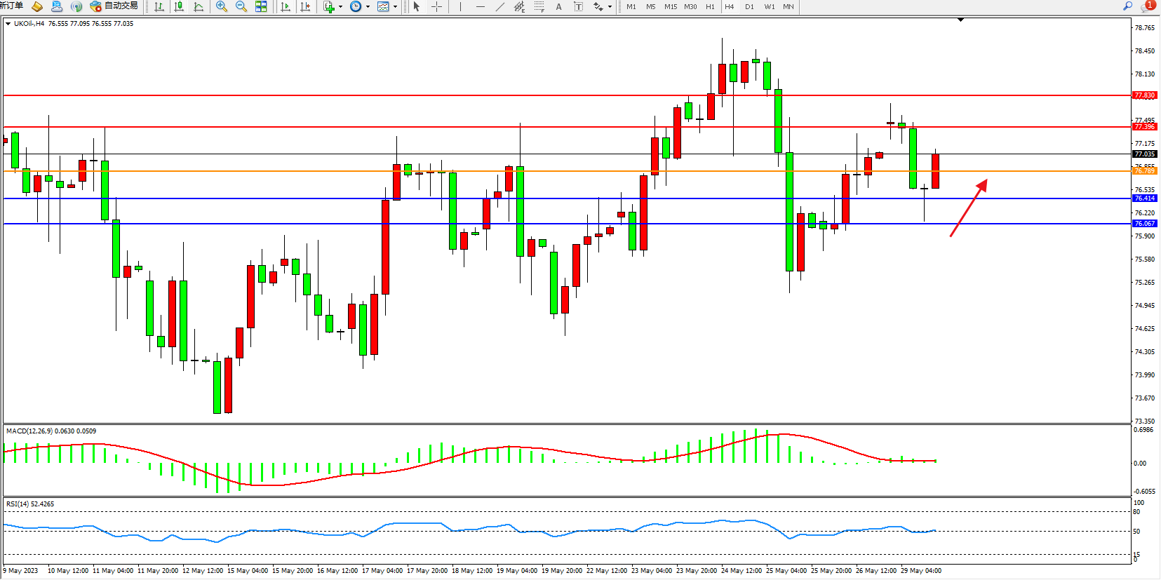 交易策略:76.789上方看涨,目标77.396 77.830