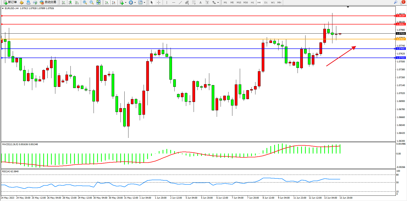 4小时图看:高位多头动力上扬后震荡,市场看涨情绪稍有减弱,但多头趋势依旧,MACD指标处于多头区域高位整理,RSI指标处于多头区域维持徘徊;