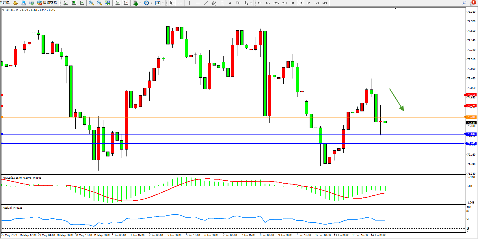 交易策略:73.784下方看跌,目标73.044 72.643