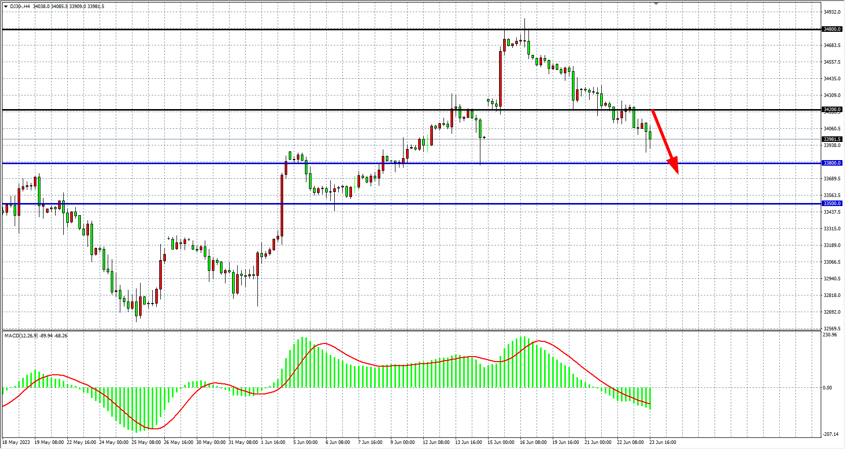 4小时图看,道指延续回落进一步下破3400点,MACD量能在零轴下继续放量,空头趋势占优,下方支撑33800-33500,上方阻力34200-34600。