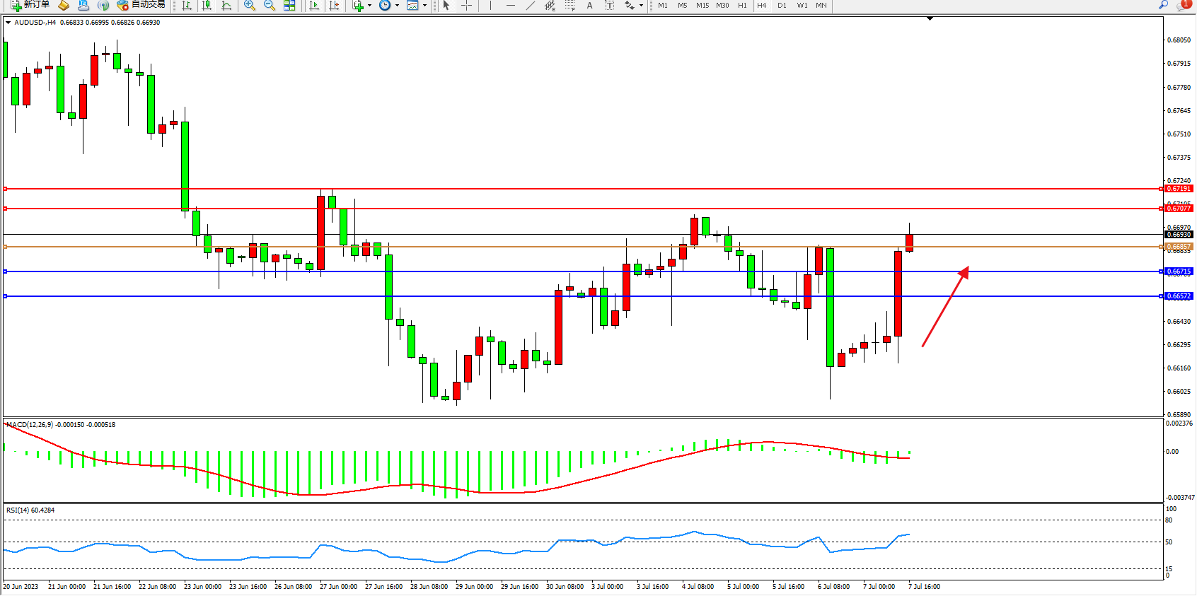 交易策略:0.66857上方看涨,目标0.67077 0.67191