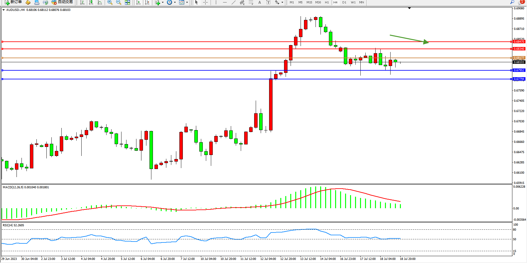 备选策略:0.68177上方看涨,目标0.68340 0.68470