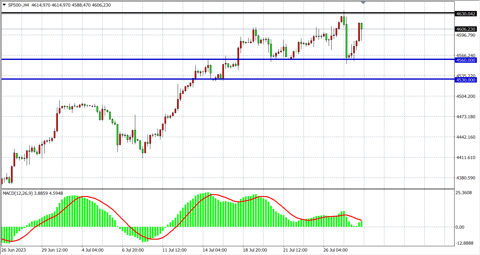 4小时图看,标普高位宽幅震荡,MACD量能在零轴上缩量,支撑继续关注4560附近,上方阻力4630。