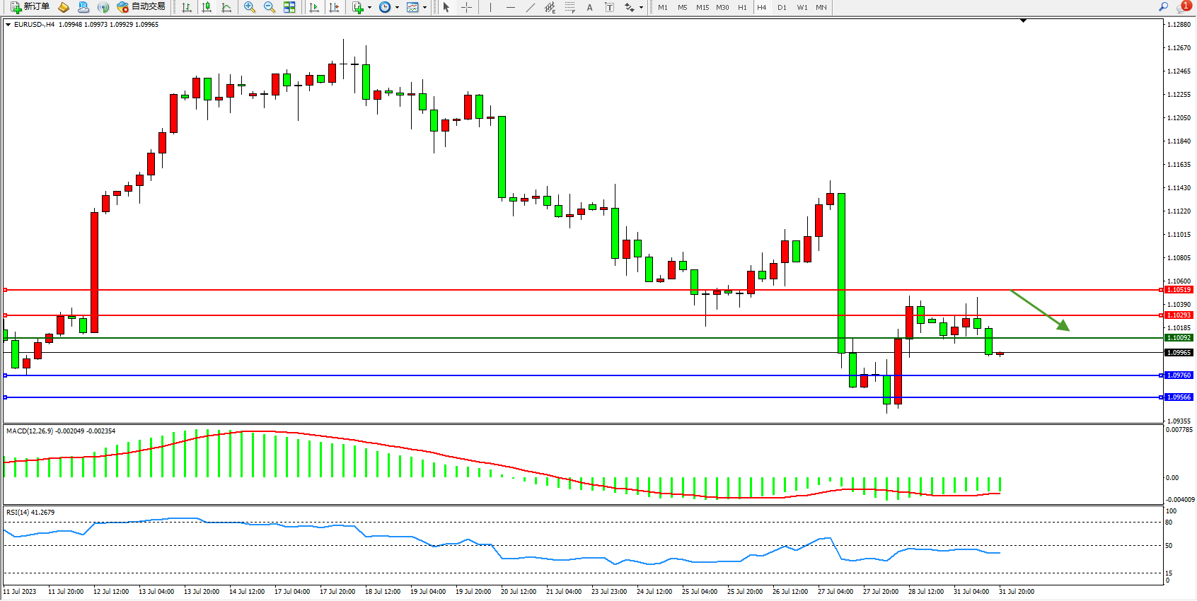 欧元兑美元维持1.09965附近震荡,由于能源和食品价格持续走低,欧元区7月份CPI年率初值下滑至5.3%,但核心通胀率仍保持在5.5%,服务业通胀率环比上升,这是工资高增长的结果。