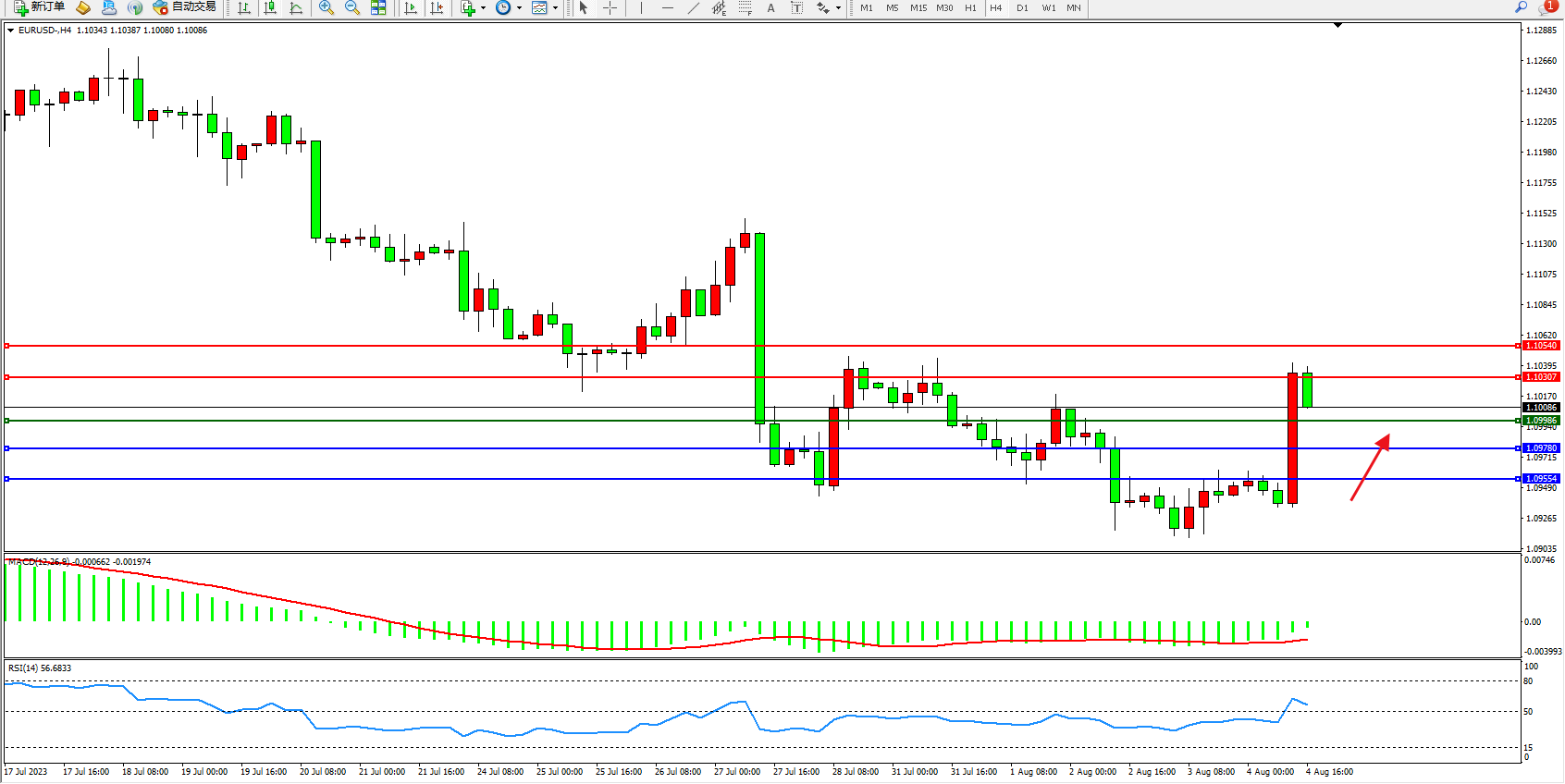 欧元美元EURUSD—4小时K线图显示: