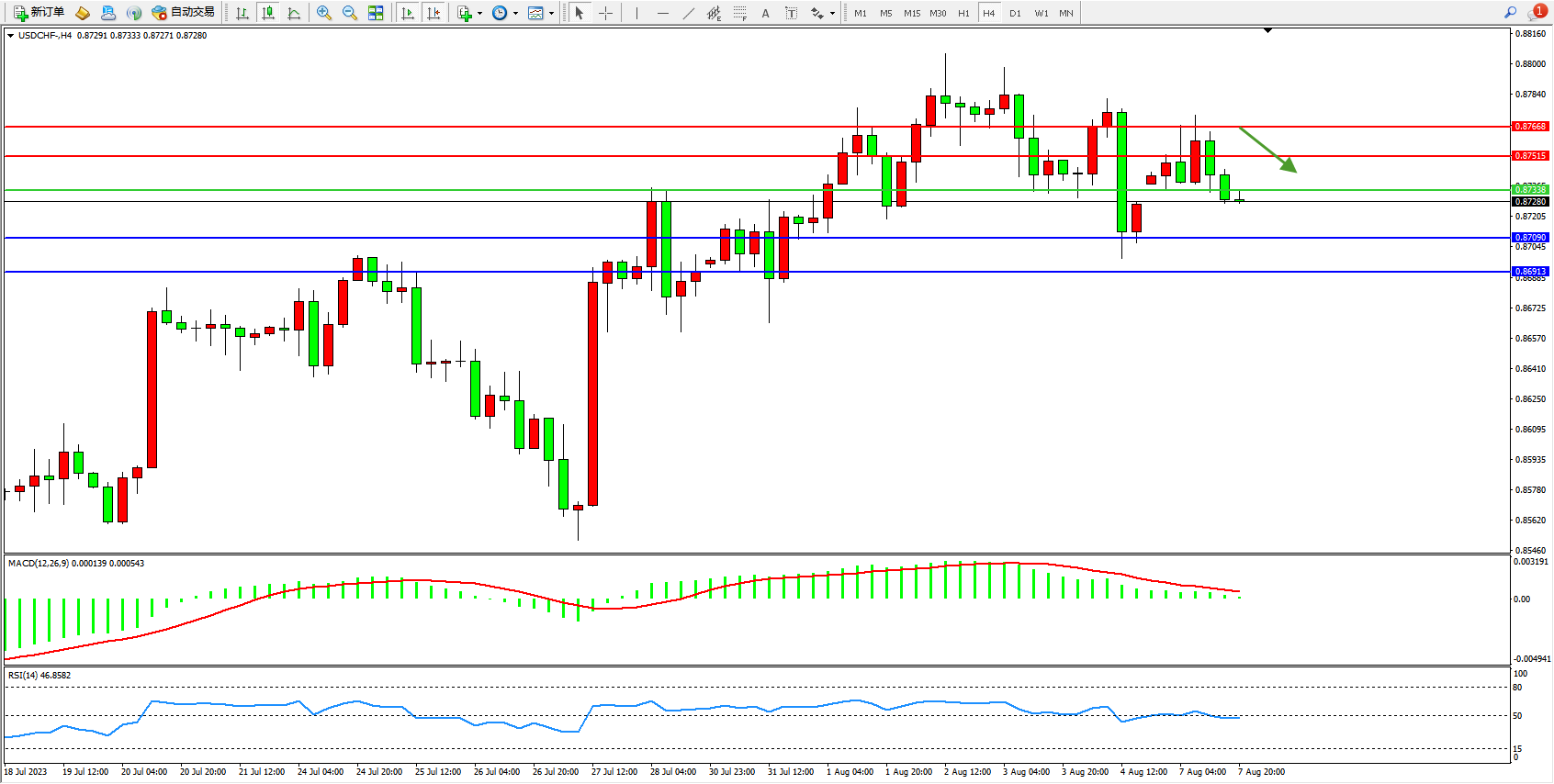 备选策略:0.87338上方看涨,目标0.87515  0.87668