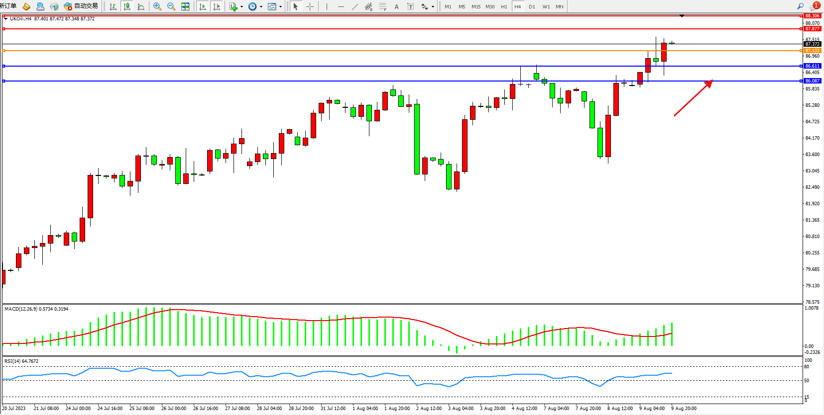 4小时图看:多头动力高位持续上扬,短期多头有继续向上移动态势,MACD指标处于多头区域不断上行,RSI指标处于多头区域维持整理;