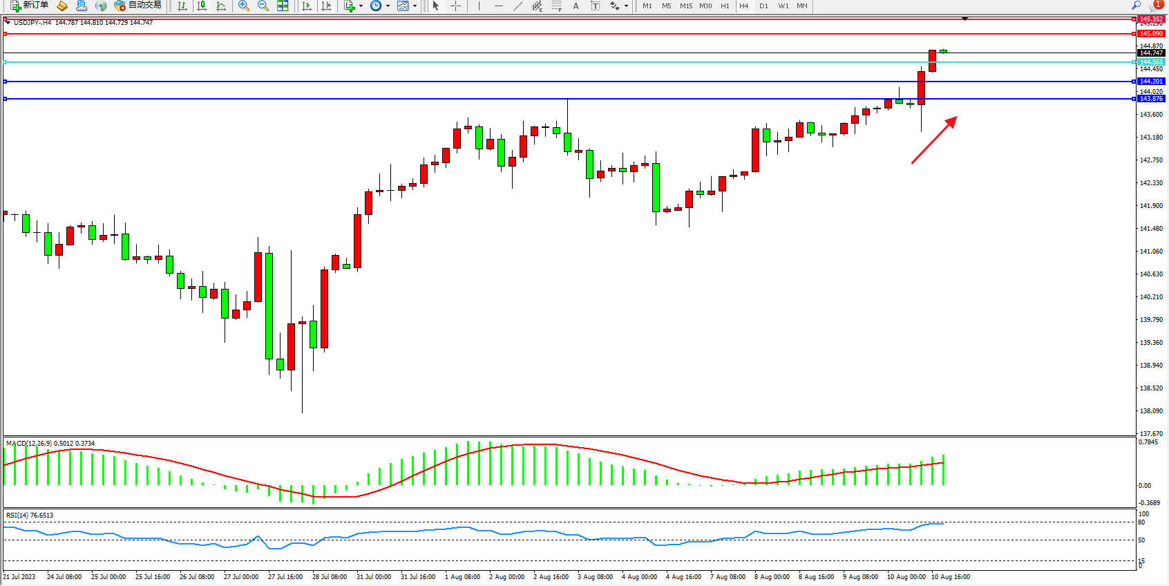 4小时图看:高位多头动力维持震荡上扬,短期看涨情绪笼罩,市场多头不断拉升中,MACD指标处于多头区域不断上行,RSI指标处于多头区域高位整理;
