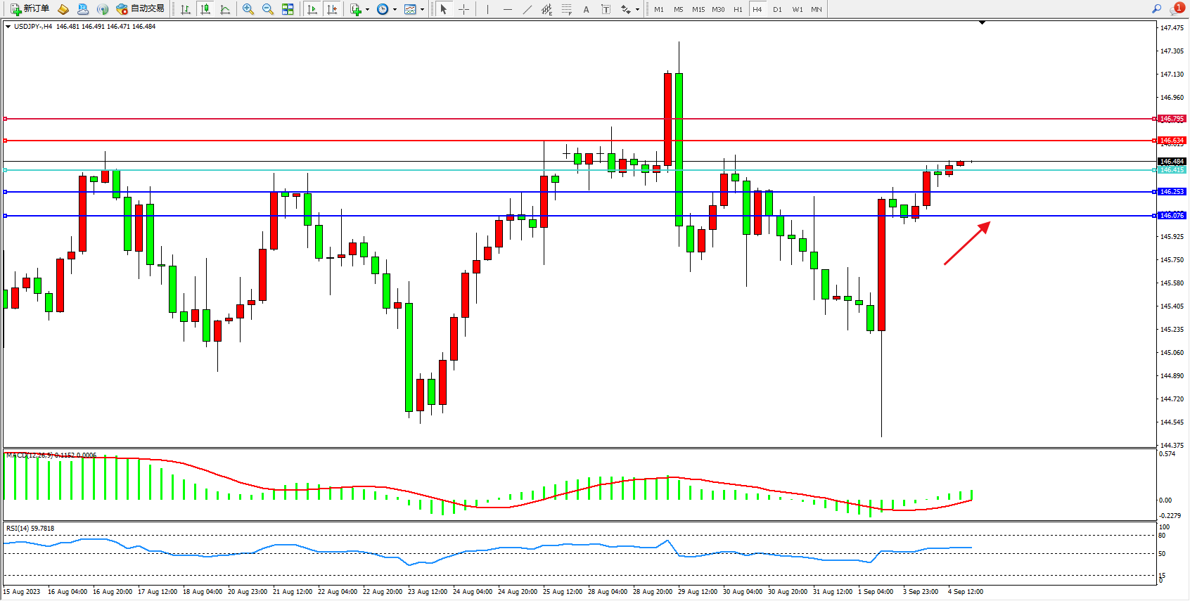 4小时图看:多头动力强势拉升上扬后整理,市场看涨情绪依旧,短期有继续整理向上移动迹象,MACD指标处于0轴线上側弱势整理,RSI指标处于50均衡线上側弱势徘徊;