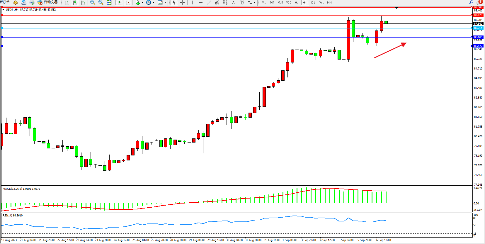 交易策略:87.261上方看涨,目标88.078  88.580