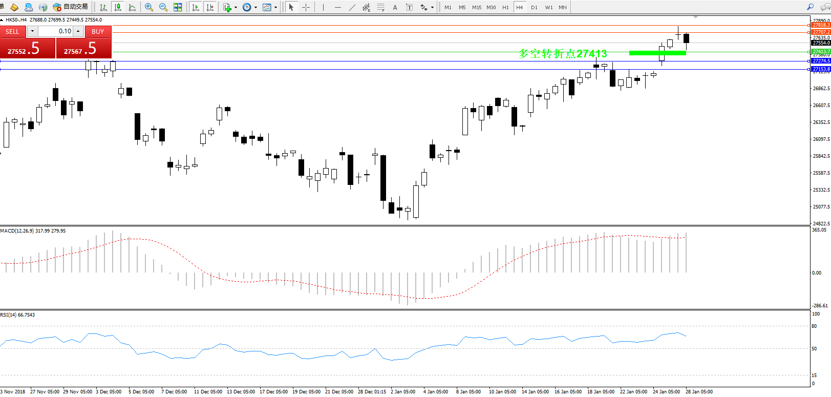 恒指HK50 ——4小时K线图显示: