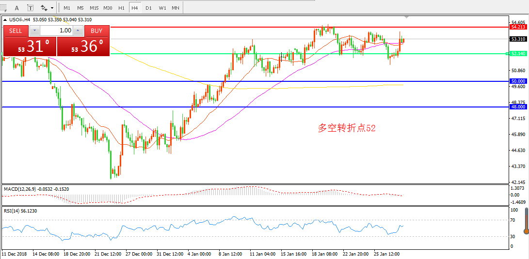4小时图看,油价经过连续整理站稳52美元,整理后受制于54美元关口, 昨日反弹后依然呈现区间震荡形态,均线系统走平, MACD红柱减少,以宽幅震荡思路对待为好。