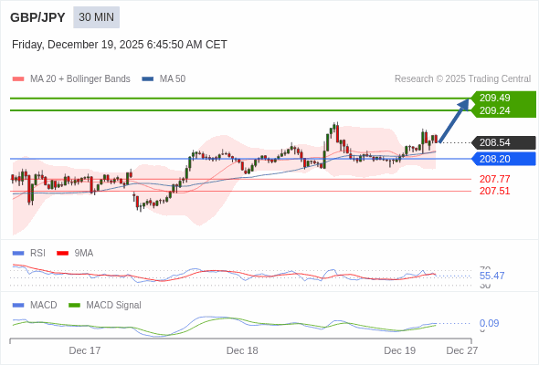 英镑/日元 当日内 : 看涨,当 208.20 为支撑位。