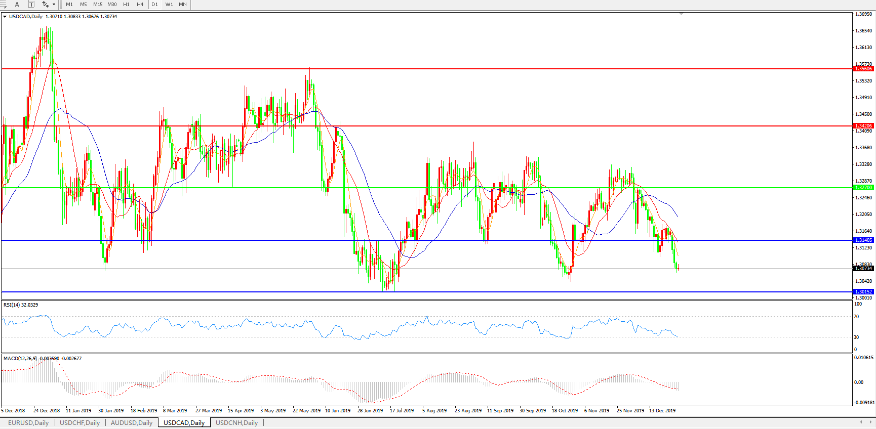 技术面简析:日线图均线呈空头排列,汇价跌破1.3140关口加速下行,MACD运行于0轴下方且量能0轴下方再度加速放量,RSI震荡走低,预计汇价将进一步下行。
