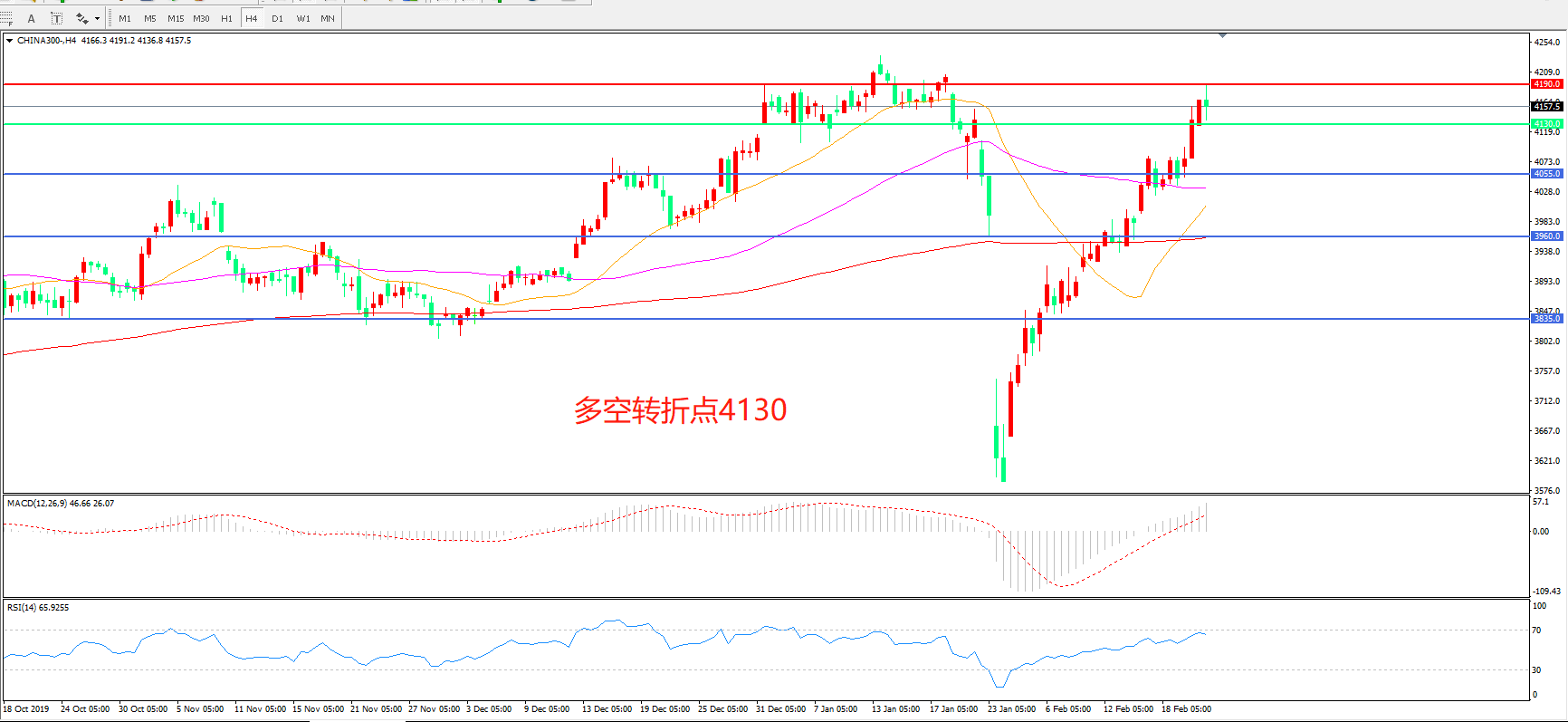 4小时图看,沪深300长阳连续拉升,整体走势偏强,4190附近是前期高点,需进行重点关注,短期均线拐头向上,MACD红柱增加,RSI指标走平,日内延续上行概率较大。