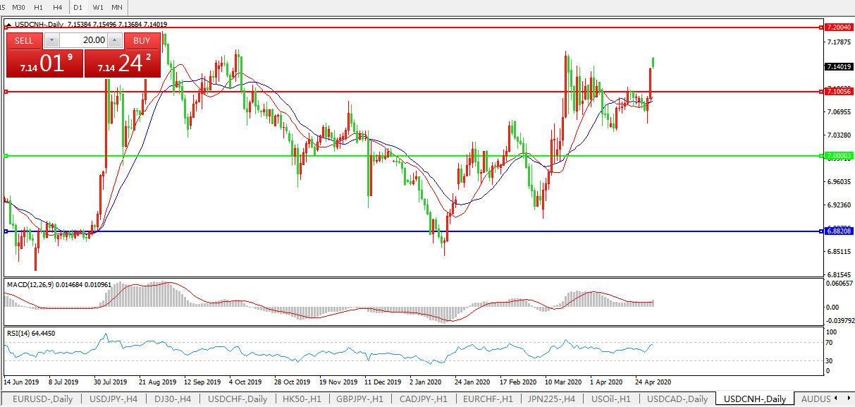 美元兑人民币USDCNH 日线图: