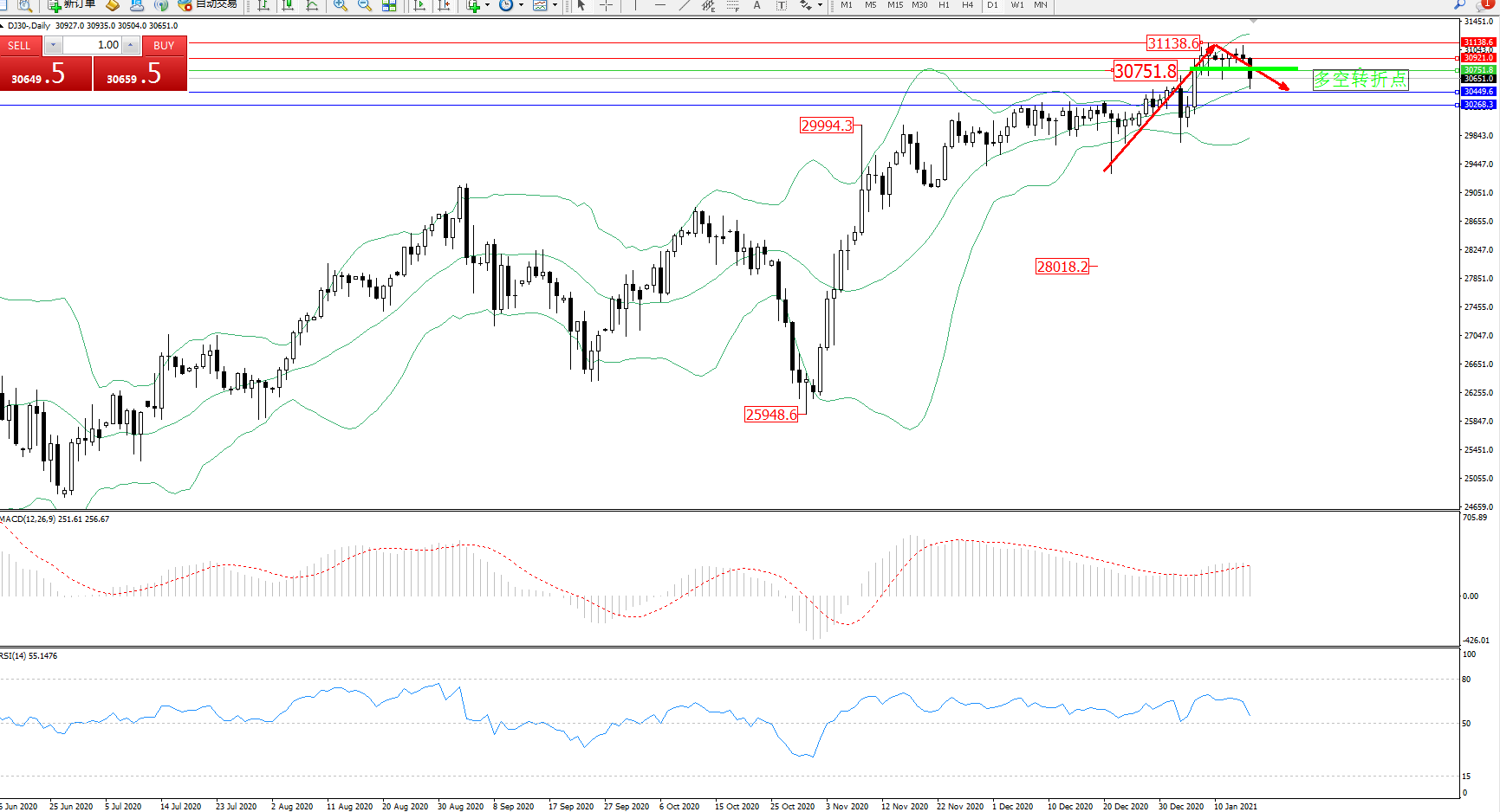 道琼斯指数DJ30—— 日K线图显示: