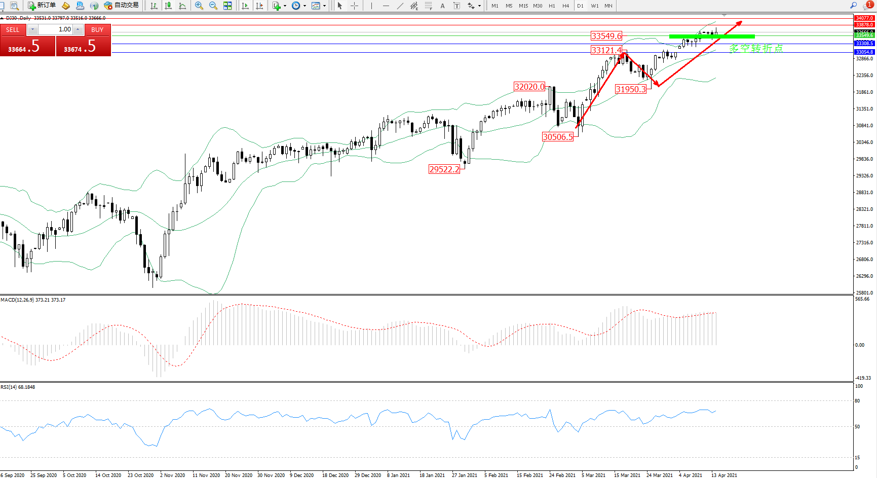 道琼斯指数4月13日(周三)收盘上涨53.62点,涨幅0.16%,报33730.89点;美股收盘,道指初步收涨,道指盘中再创新高,美国经济复苏加速至温和步伐,受疫苗接种增加和强有力的财政支持提振,更多消费者打开钱包,在旅行和其他商品上支出更多。首日上市的加密货币交易所Coinbase市值一度突破1120亿美元,后股价跌破发行价。交易员仍在消化一些全球最大银行的业绩报告。高盛大涨,摩根大通下挫,因市场对贷款需求前景感到担忧。市场持续呈现拉锯态势,投资者正在权衡经济走强前景,同时又要顾虑到通胀压力上升风险。美联储主席鲍威尔表示,美联储正在等待价格和就业达到目标后再考虑加息,这也给美元带来压力。