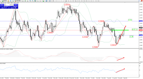 低位多头动力持续震荡上扬,即将触及布林带指标上轨附近节点,布林带指标呈收口平移走势中,上方压制关注1.39828附近,低位支撑关注布林带指标中轨1.37568附近节点,关注1.38379附近转折点,MACD指标处于空头区域低位震荡上移至0轴线附近徘徊,RSI指标处于50均衡线附近整理后开始上行中,如图: