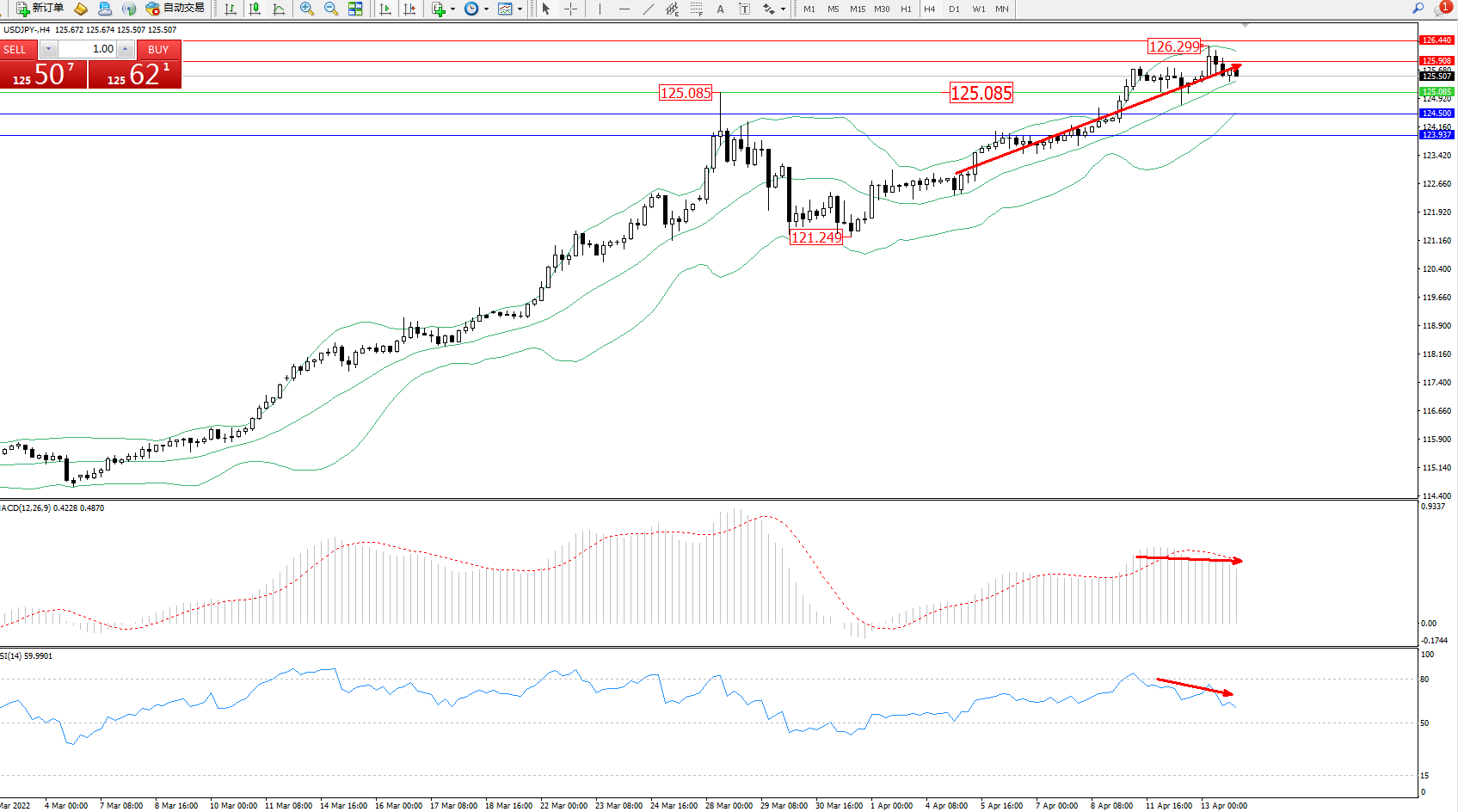 技术点评:多头动力延续布林带指标通道中上轨区间持续震荡上扬,高位抵达126.299附近整理,短期多头动力有进一步上扬态势,布林带指标呈上行趋势走势态势良好,高位开始缓慢收口走势中,MACD指标处于多头区域维持整理平移,RSI指标处于多头区域维持窄幅整理缓慢下行;