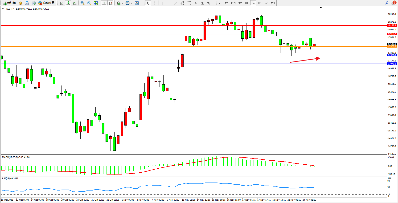 香港恒生指数11月25日(周五)收盘下跌87.32点,跌幅0.49%,报17573.58点;恒生指数本周累跌2.33%;港股三大指数集体收跌,恒生科技指数领衔走低,大幅下跌2.31%,恒指、国指分别跌0.49%及0.35%。权重科技股全线下挫,专家预计降准或短期内落地,内房股、银行股上涨明显,今冬最强寒潮来袭,煤炭股走强,中字头继续活跃。南下资金全日净流出3.1亿港元,大市成交额为947亿港元。