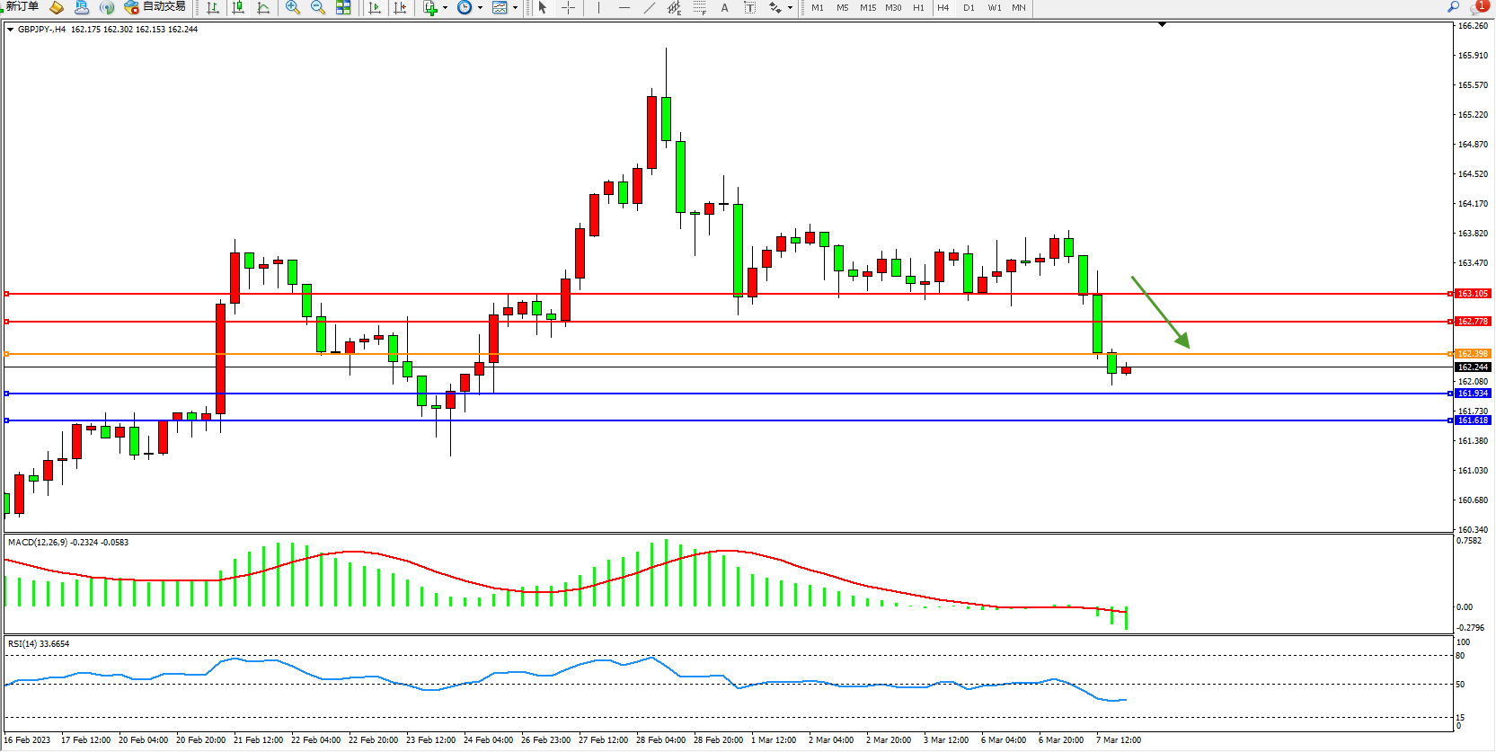 4小时图看:空头动力持续震荡下挫,短期跌势或将延续,市场整体处于向下移动中,MACD指标处于空头区域持续下行,RSI指标处于空头区域维持整理;